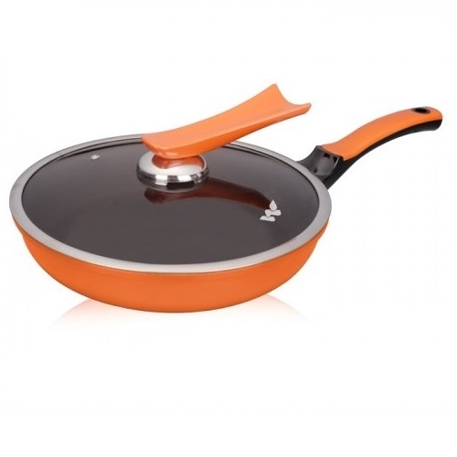 - Die-cast orange dream fry pan - Size: dia: 26 cm x h: 5.5 cm - Interior: Xylan Plus 2 layer coating from whitford USA - Exterior: Heat resistant coating - Two color bakelite handle. - Lid: Wide edge T-glass with stand by knob