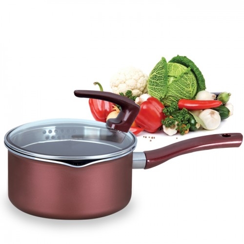 - 18CM alumnium diversion easy saucepan with induction bottom - Thickness:2.5mm - Interior coating: Xylan plus 2 coated from Whitford USA - Exterior coating: Heat resistent color coating. - Bakelite handle with color coated. - Diversion glass lid with stand up kn